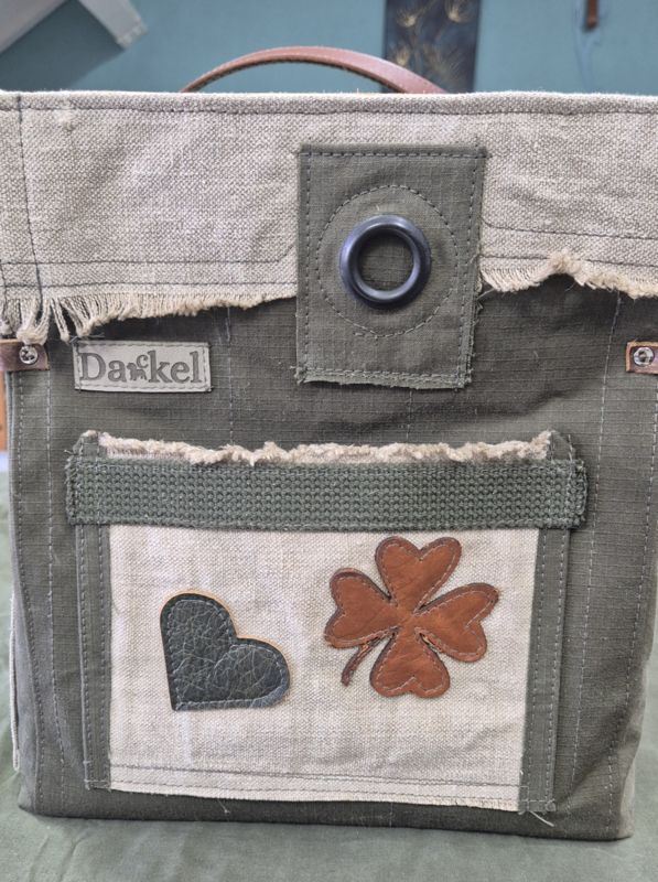 - Totebag gemaakt van plunjezak, postzak, leer en voeringstof