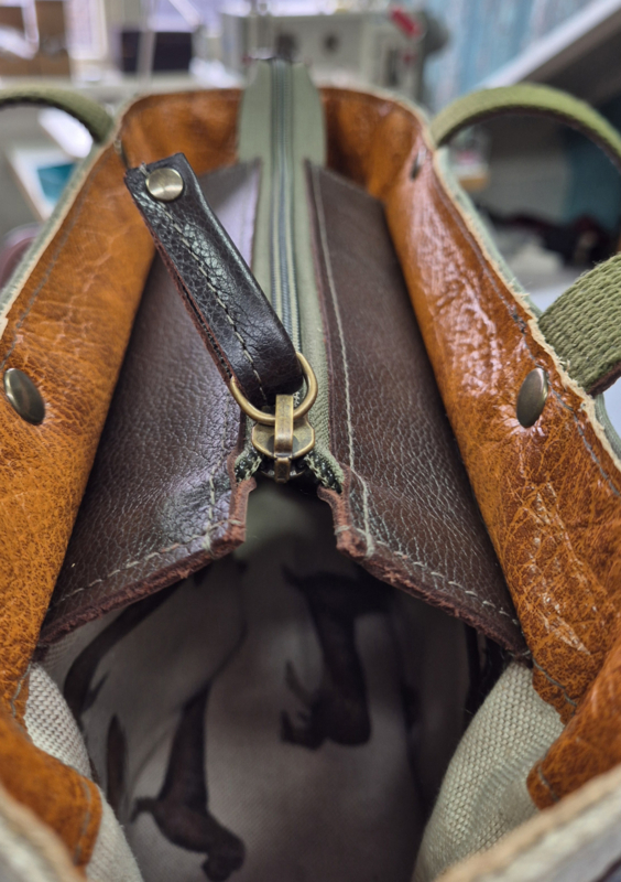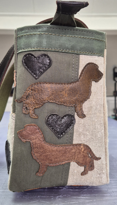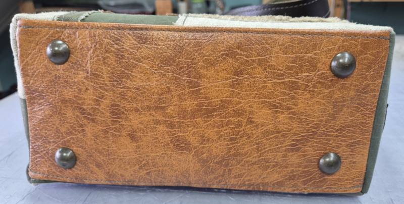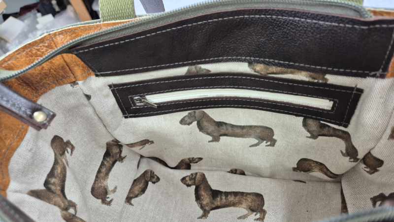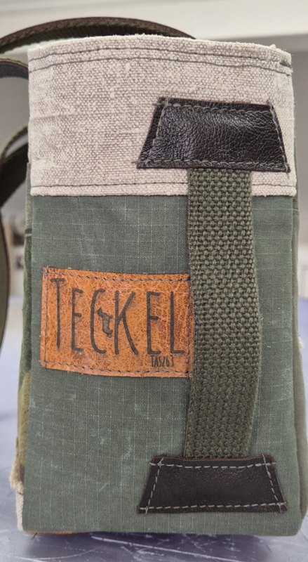 Kleine Totebag gemaakt van Plunjezak, postzak, bruintinten leer en voeringstof € 89,=
