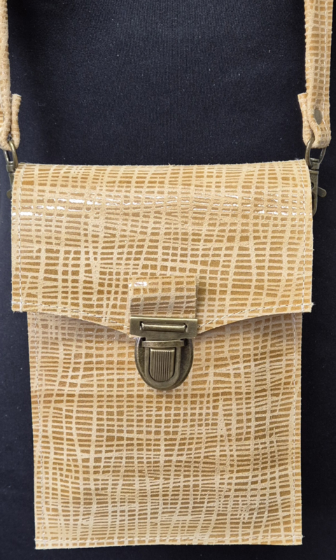 Telefoontasje L Slangenprint leer Applicatie: reliëf pootje 2 vakken en klein vakje voor een pasje. Tictuc sluiting brons kleur Schouderband met musketons van ca. 130 cm Hoogte 19 cm, breedte 14 cm