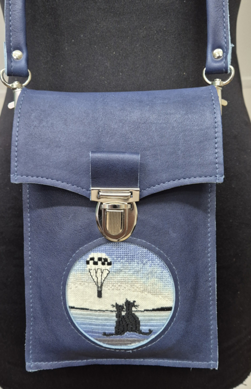 Telefoontasje L blauwleer klein borduurwerkje ca 7,5 cm 2 vakken en klein vakje voor een pasje. Tictuc sluiting: zilver kleur Schouderband met musketons van ca. 130 cm Hoogte 19 cm, breedte 14 cm