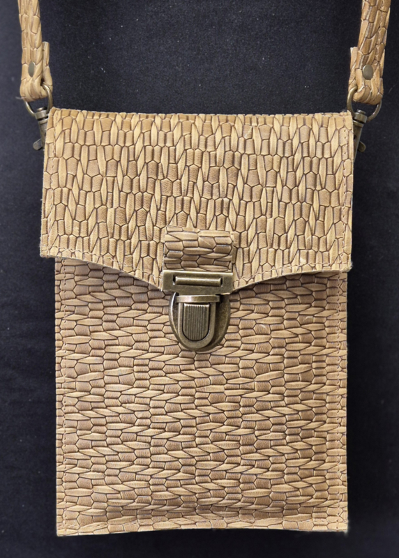 Telefoontasje L weefprint 2 vakken en klein vakje voor een pasje. Tictuc sluitingbrons Schouderband met musketons van ca. 125cm Hoogte 19 cm, breedte 14 cm