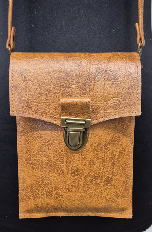 Telefoontasje L cognac kleurig buffelleer 2 vakken en klein vakje voor een pasje. Tictuc sluitingbrons Schouderband met musketons van ca. 130cm Hoogte 19 cm, breedte 14 cm